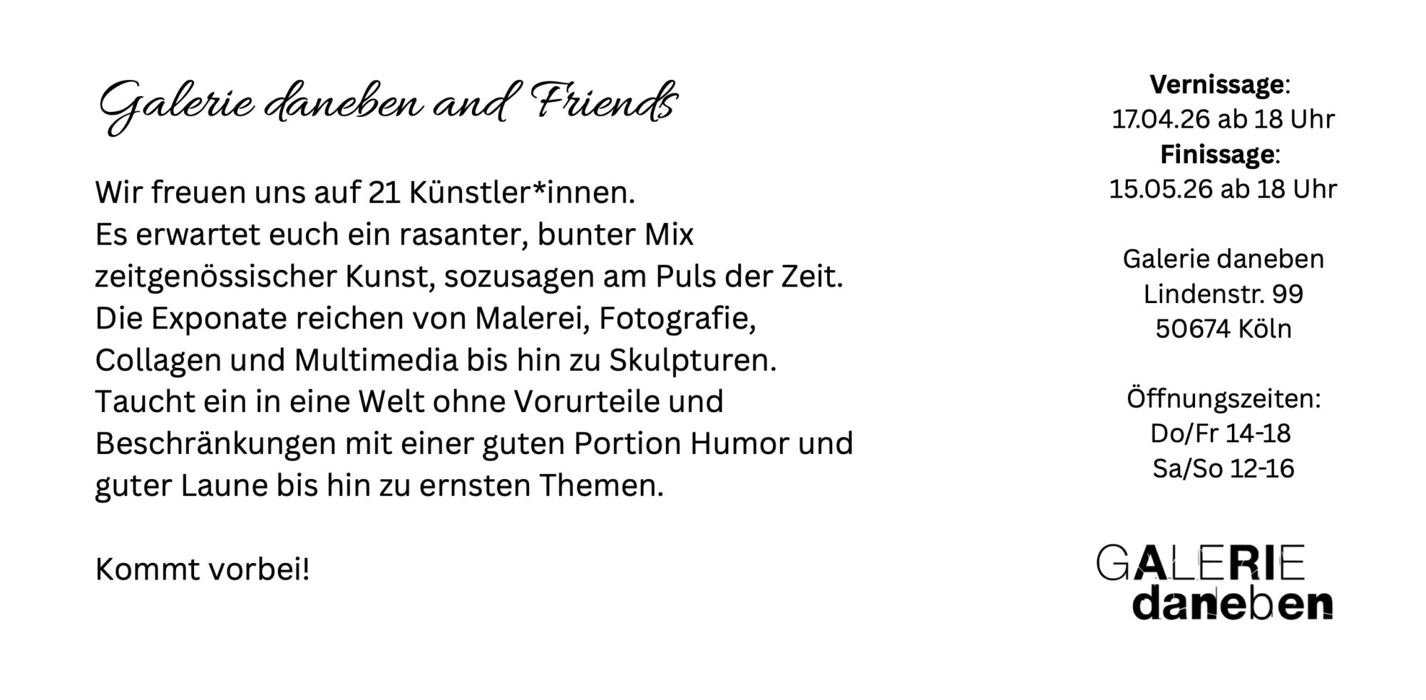 Galerie daneben and Friends – Ausstellung vom 17.04.2026 bis 15.05.2026 in Köln